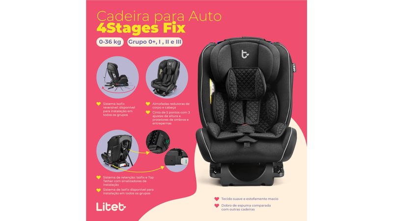 A 4stages Fix Litet é economia com segurança. Afinal, não é necessário trocar a cadeirinha, já que ela acompanha cada fase de crescimento da criança, e, pela qualidade do material e preservação, pode ser repassada do filho mais velho para o caçula. Não há dúvidas, que é uma escolha que vai caber no seu bolso.