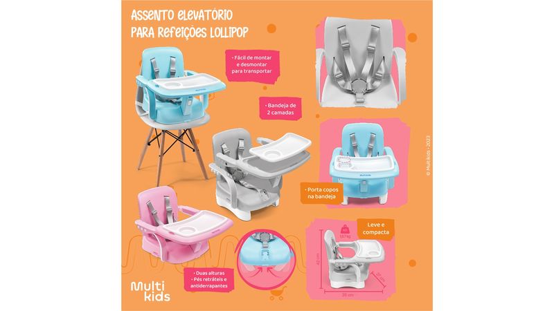 Indispensável para a fase da introdução alimentar, o assento Lollipop da Multikids vai proporcionar facilidade e simplicidade no dia a dia. Super fácil de montar e desmontar, ele é ideal tanto para usar em casa quanto fora, para garantir que seu pequeno sempre tenha comodidade e segurança para curtir a refeição.