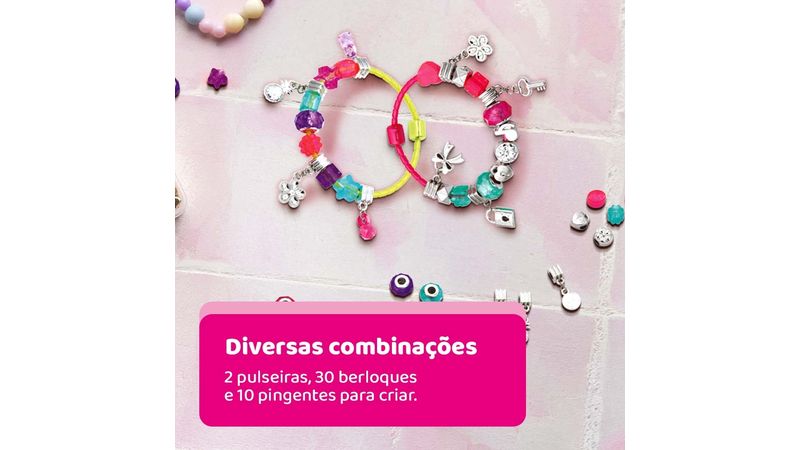Perfeita para quem ama brilhar, esta coleção vem repleta de tudo o que você precisa para criar acessórios únicos e personalizados. Com 2 pulseiras, 30 berloques e 10 pingentes, as possibilidades são infinitas!