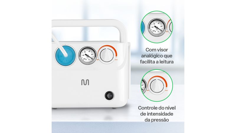 Compacto e silencioso, ele pode ser usado também por dentistas para sugar a saliva do paciente sem interferir no tratamento odontológico. O Aspirador possui controle do nível de intensidade da pressão, conta com uma garrafa resistente coletora de fluídos que é protegida contra estouros, e deve ser manuseado apenas por profissionais da saúde ou pessoas que tenham conhecimento técnico para realizar o tratamento.
