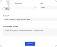 Selecione o(s) produto(s) que deseja trocar ou devolver clicando na caixa de marcação. Escolha uma ação (trocar ou devolver). Selecione o motivo e, se desejar, deixe mais detalhes sobre o motivo da troca ou devolução. Depois clique em Continuar