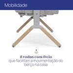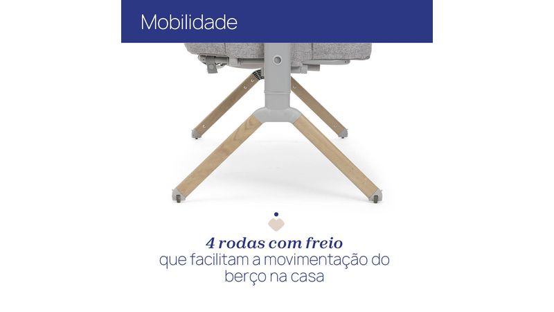 A instalação lateral com sistema de deslize torna a fixação rápida e simples, enquanto as 4 rodas com freio permitem movimentar o berço pela casa com facilidade. Com comprimento compacto de apenas 55 cm, é ideal para espaços menores, sem abrir mão do conforto.