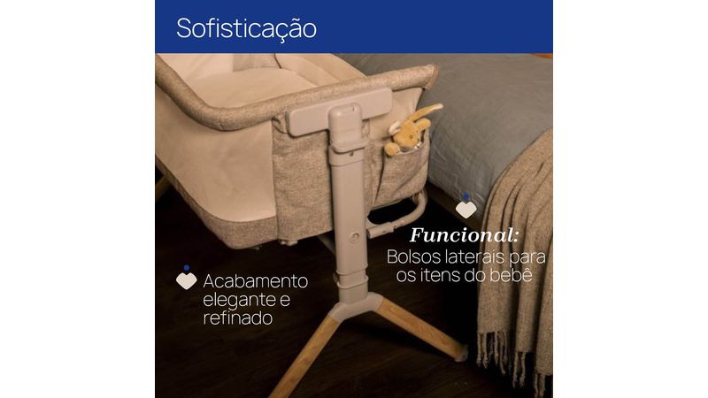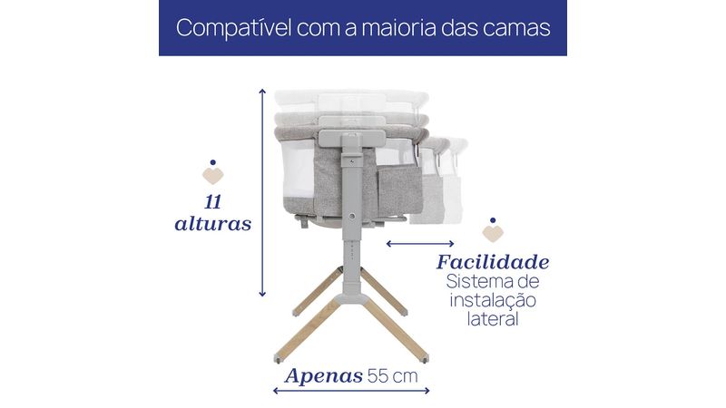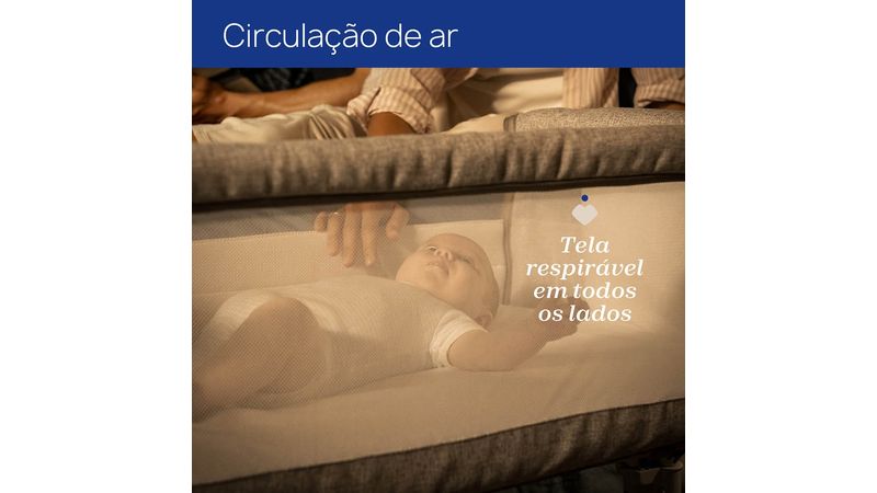 Segurança e conforto são prioridades: todas as laterais são feitas em malha respirável, garantindo excelente circulação de ar e um ambiente fresco para o seu pequeno. Compatível com a maioria das camas e com 11 níveis de altura ajustáveis, o berço facilita o co-sleeping de forma segura e confortável.