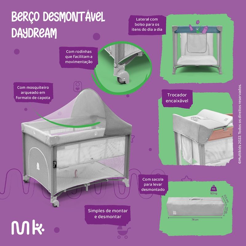 O Berço Desmontável Daydream não só oferece um ambiente seguro e confortável para seu bebê descansar, como também é um aliado indispensável em suas viagens. Seja em longas férias ou em curtas escapadas, este berço é a escolha ideal.