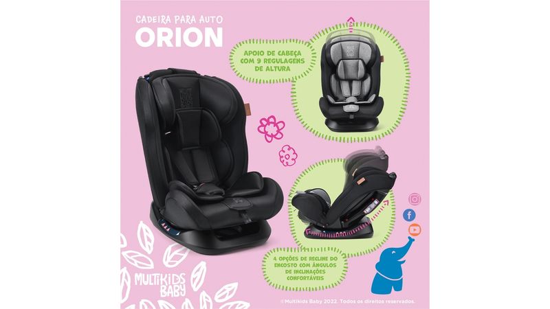 A cadeira para auto Orion Multikids Baby usa o cinto de 3 pontos do veículo como sistema de retenção e por isso é compatível com praticamente todos os veículos do mercado. São 4 opções de recline de encosto em ângulos que deixam a cadeira confortável para o seu bebê. O apoio de cabeça pode ser ajustado em 9 alturas diferentes, para ir assim acompanhando o crescimento do seu pequeno. O tecido é suave e removível para facilitar a higienização. O estofamento é macio e vem com almofada redutora de corpo e cabeça para acomodar melhor os bebês menores. A Orion é ideal para quem procura uma única cadeira para toda a infância sem abrir mão do conforto e é claro, da segurança.
