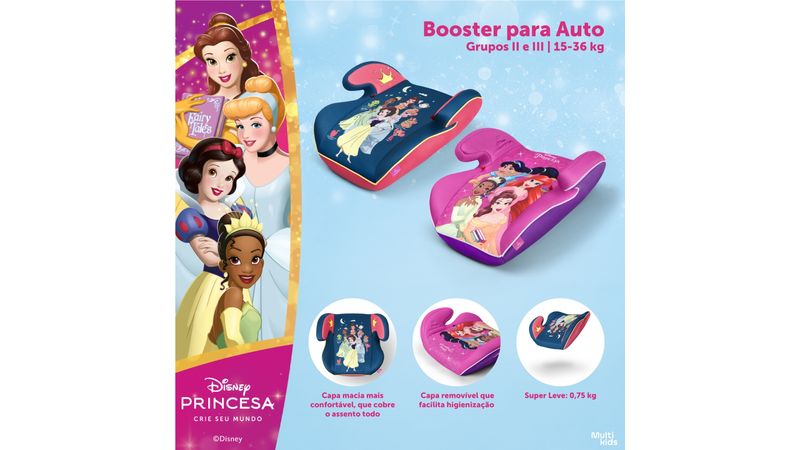 O Booster Disney Princesas é a combinação perfeita de segurança, conforto e diversão para os passeios com sua pequena. Indicado para crianças dos grupos 2 e 3 (15 a 36 kg), este assento de elevação infantil é fabricado em polipropileno (PP) resistente, sem sistema de ancoragem, garantindo fácil instalação e leveza. Possui capa temática em poliéster com as cores rosa e roxo, além de apoio de braços para mais conforto durante o uso. Produto licenciado da marca Disney, ideal para transformar cada viagem em um momento mágico!