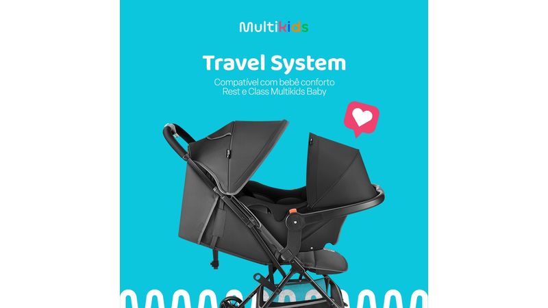 O carrinho de bebê Multikids Spy conta ainda com suporte Travel System para você levar o bebê conforto da linha Multikids Baby e ter mais uma opção para o seu bebê descansar.