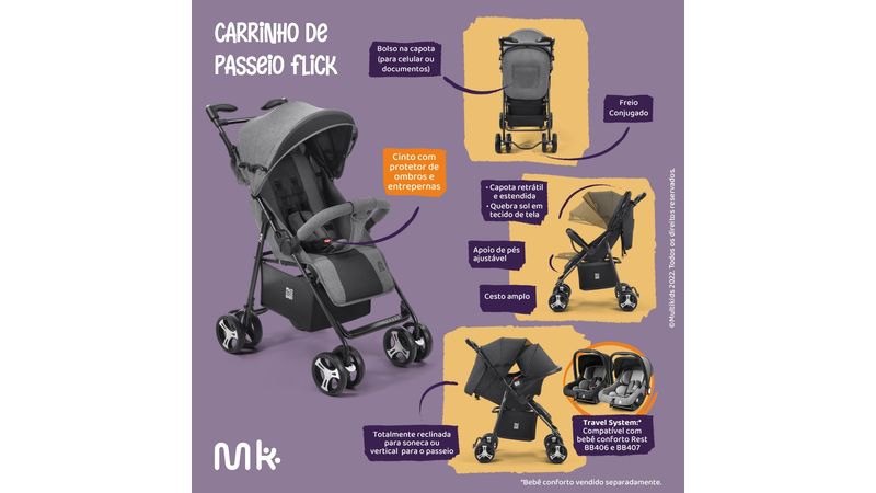Conta também com um quebra sol e visor com tampo, permitindo que os pais deem uma espiadinha no seu bebê sem precisar parar o passeio. Com cesto de compras super amplo, fica fácil e prático levar tudo que é preciso para não passar aperto durante o passeio. No quesito de segurança, o carrinho Flick tampouco deixa a desejar: suas rodas duplas com diâmetro de 17 cm oferecem maior estabilidade, inclusive em terrenos mais acidentados. As rodas dianteiras são equipadas com sistema giratório com travas, sendo possível deixá-las retas ou acompanhando o movimento, conforme for mais adequado. O cinto de 5 pontos com protetores de ombro e entrepernas deixa o bebê seguro sem ficar desconfortável. E além de todas essas vantagens, o Flick é travel system e acopla bebê conforto, super prático e fácil para mover o bebê do carro pro carrinho e vice versa, sem precisar incomodar ou acordar seu pequeno.