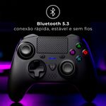 Com conectividade Bluetooth 5.3, o pareamento é rápido e estável, e a bateria recarregável de 1000mAh permite jogar por longas horas sem interrupções. Para ainda mais praticidade, a entrada P2 de 3,5 mm possibilita conectar fones com microfone diretamente ao controle, garantindo foco total durante o jogo.