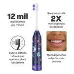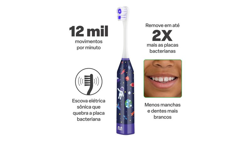 Com incríveis 15 mil movimentos sônicos por minuto, nossa escova quebra a placa bacteriana de forma eficiente, garantindo uma limpeza profunda. As cerdas macias são delicadas com a boca da criança, proporcionando uma experiência confortável durante a escovação.