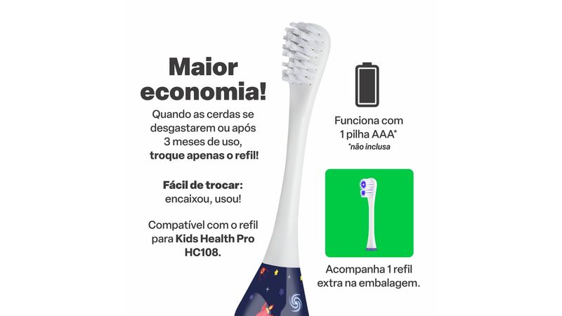 Nossa escova infantil funciona com apenas 1 pilha AA e é resistente à água, o que a torna perfeita para uso diário. Além disso, ela remove até 2 vezes mais placas bacterianas do que as escovas tradicionais, proporcionando uma higiene oral superior para seus pequenos.