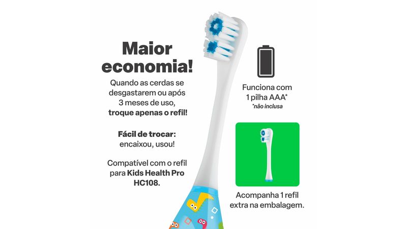 Nossa escova elétrica funciona com 1 pilha AA, garantindo durabilidade e praticidade. E para sua conveniência, a embalagem inclui 1 escova e 1 refil extra, para que você tenha sempre uma escovação eficaz ao alcance das mãos.