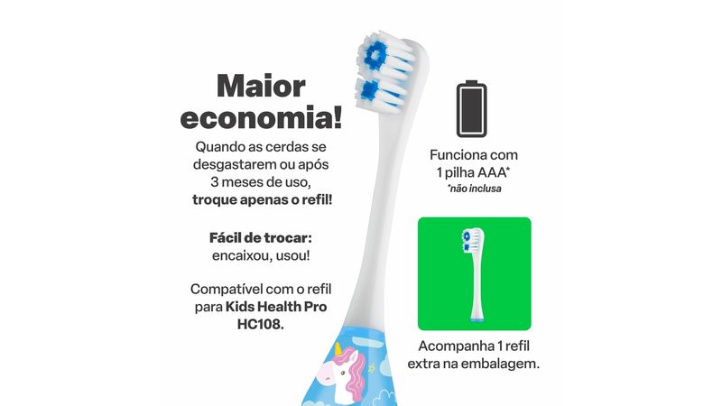 Não se preocupe com a reposição, pois a embalagem inclui não apenas a escova, mas também um refil extra. Dê ao seu filho a confiança de um sorriso saudável desde cedo.