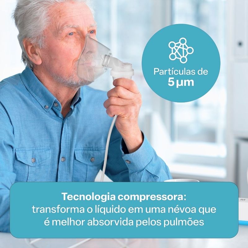 Com apenas 208g, este inalador é leve e compacto, trazendo praticidade para o momento da inalação e no tratamento de doenças respiratórias. Além disso, sua aceitação universal de soros e medicamentos garante versatilidade e eficácia no tratamento. E o melhor de tudo, é bivolt, podendo ser utilizado em tomadas 110V ou 220V, proporcionando conveniência em qualquer lugar.