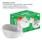 1 Inalador; 1 Máscara infantil; 1 Máscara adulta; 1 Bocal; 1 Copo para soros e medicamentos; 1 Tubo de ar; 1 Elástico de fixação; 1 Manual de Instruções.