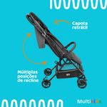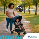 A condução é suave e segura graças às rodas dianteiras duplas e giratórias, que facilitam manobras em diferentes tipos de piso, enquanto o freio conjugado proporciona total controle nas paradas. O conforto do bebê é garantido pelo encosto com múltiplas posições de reclino, incluindo posição para descanso, ajustável com apenas um botão, além do apoio para os pés com altura regulável, evitando que as pernas fiquem penduradas.
