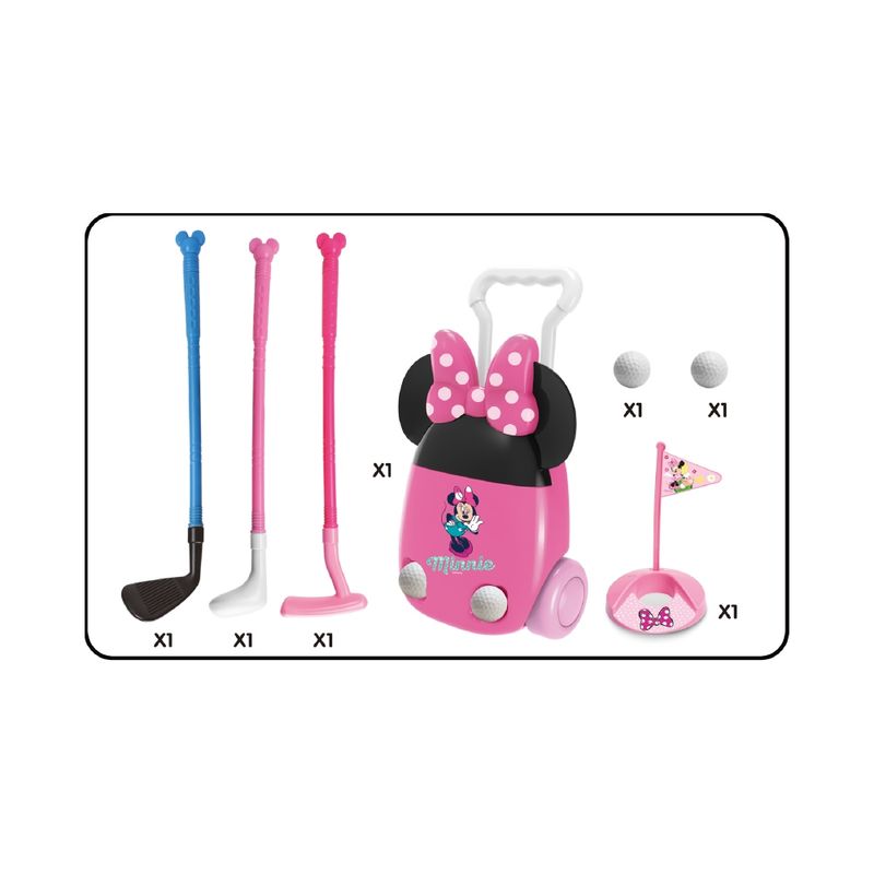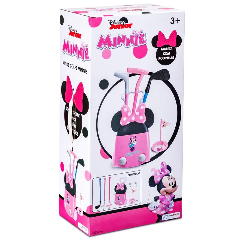 O Kit acompanha uma linda maleta de golfe da Minnie com 3 tipos diferentes de tacos, 2 bolinhas de golfe e uma bandeira de pontuação. Treine, brinque e jogue, adicionando seus próprios obstáculos e rotas para se tornar um especialista no golfe!