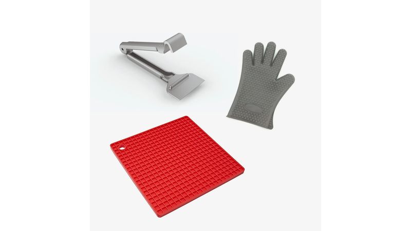 Ele acompanha um pegador inox, para retirar seus alimentos com segurança, uma luva de silicone para que você possa abrir a Multifryer sem se queimar, e, também um apoio de silicone, assim, você consegue colocar seus alimentos para esfriar e saboreá-los em seguida.