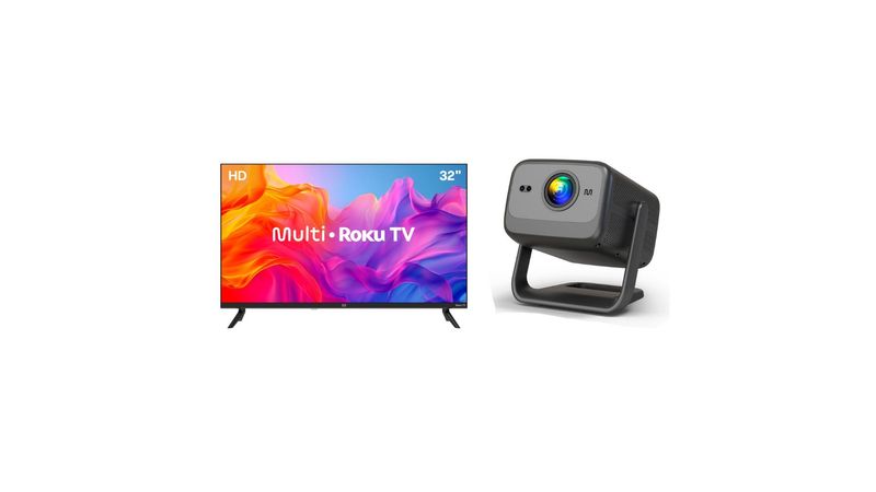 O combo perfeito para entretenimento completo: Multi Roku TV 32" Smart HD + Projetor Smart Full HD PJ280NLeve sua experiência de assistir filmes, séries e jogos a outro nível com este conjunto incrível da Multi. A união da