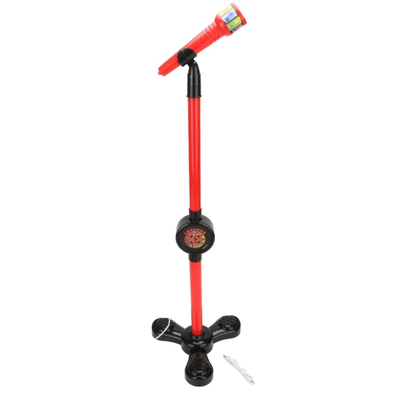 Acompanha cabo de conexão P2 para conectar o seu próprio celular e cantar as suas músicas preferidas. Pedestal com luz e altura ajustável, adaptando a altura das crianças conforme o crescimento.