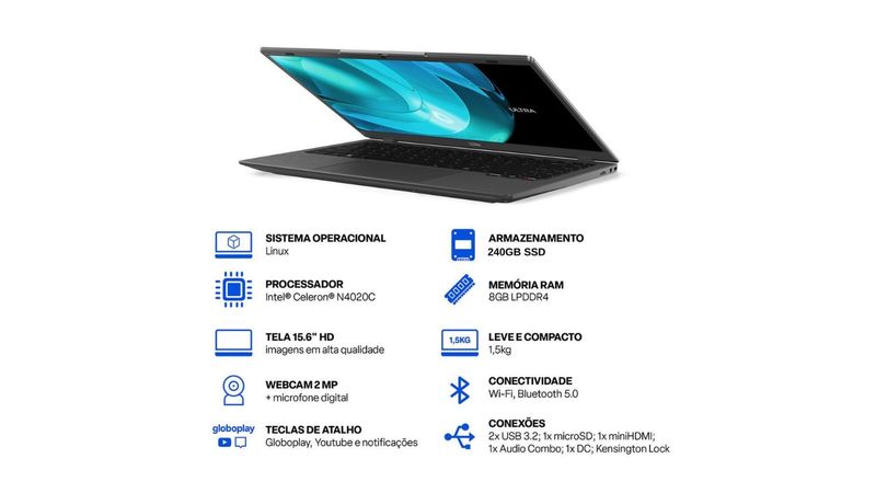 Design finoCom aparência elegante em cinza escovado, o design fino do Notebook Multi Ultra Linux de 15.6” cabe na mochila ou na bolsa, sendo ideal para quem está sempre em movimento.