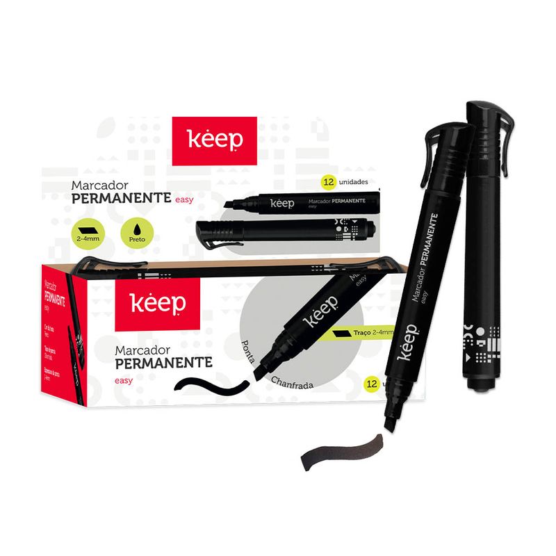 O marcador permanente Easy da Keep possui ponta chanfrada de 2-4mm e pode ser utilizado em diversas superfícies, como papel, madeira, metal, vidro, entre outras.