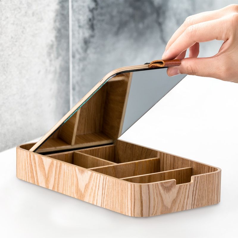 Seu material é de madeira, trazendo modernidade e estilo para a bancada do seu banheiro ou quarto. Além disso, o Porta-Joias contém um espelho, para você checar como ficou a sua composição e arrasar!