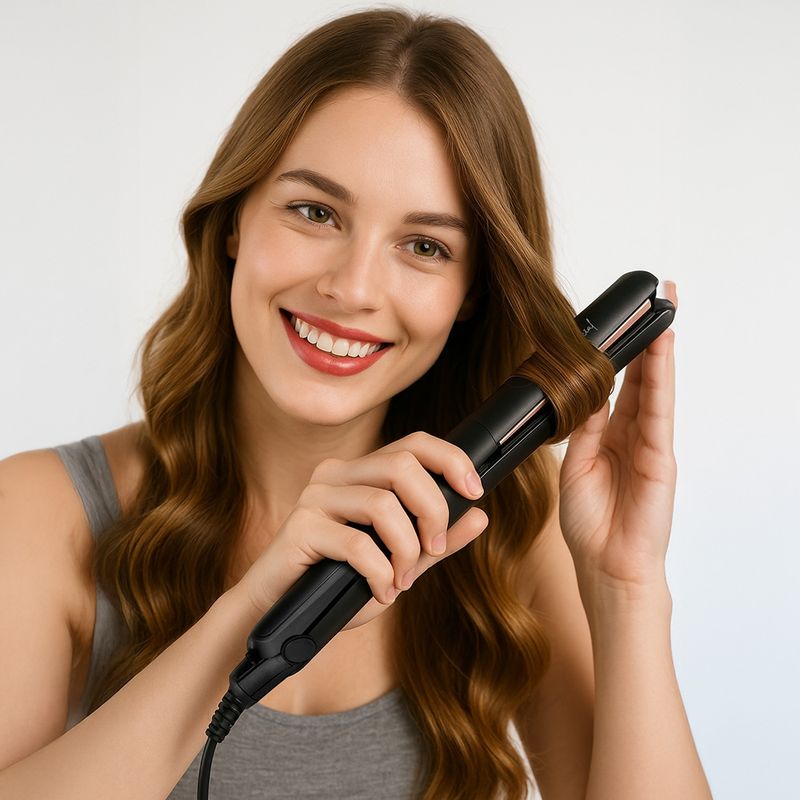 formato arredondado facilita a criação de ondas e cachos, além do alisamento tradicional, trazendo mais versatilidade para seus penteados.