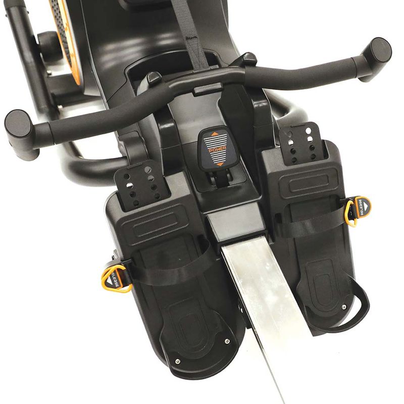 Este remo também conta com um mecanismo que permite que os usuários insiram rapidamente os pés nos apoios e puxem a alça para um ajuste seguro. Para sair, basta apertar o botão para soltar a alça, facilitando sua entrada e saída no equipamento.