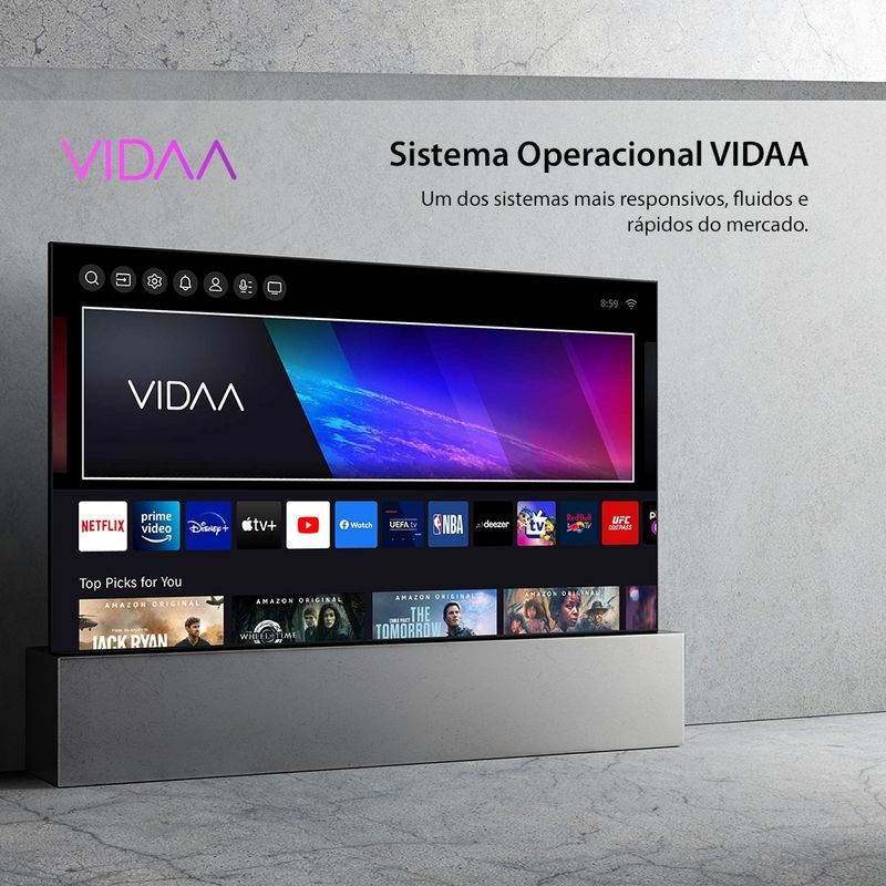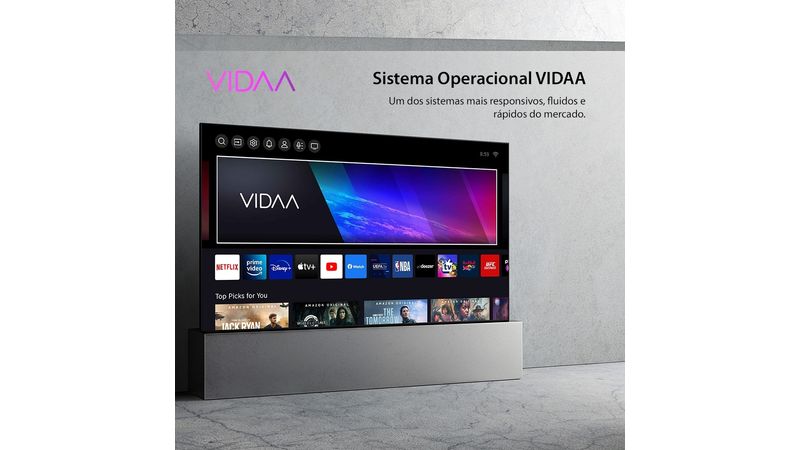 Sistema operacional VIDAASurpreendentemente rápido, ele é personalizável, completo e oferece acesso aos principais aplicativos, como Netflix, YouTube, Prime Video, Disney+, Apple TV+ e muitos mais.*