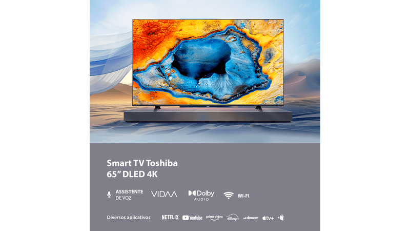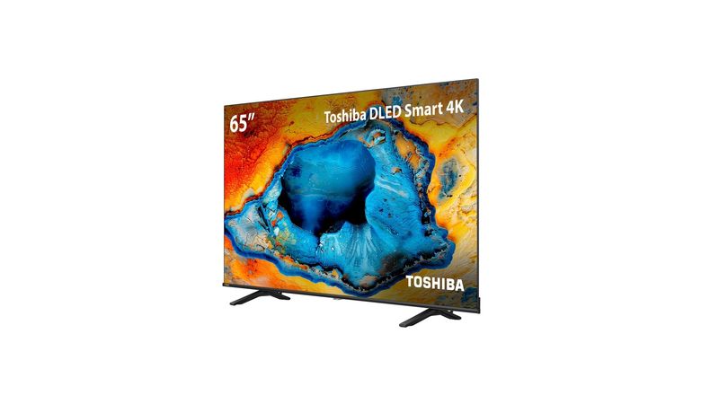 Smart TV DLED 65" 4K Toshiba 4K, seus problemas de entretenimento em casa são coisa do passado. Com imagens tão nítidas que parece que você está olhando através de uma janela, cores tão vibrantes que saltam da tela e um sistema de áudio que o coloca no centro da ação, está