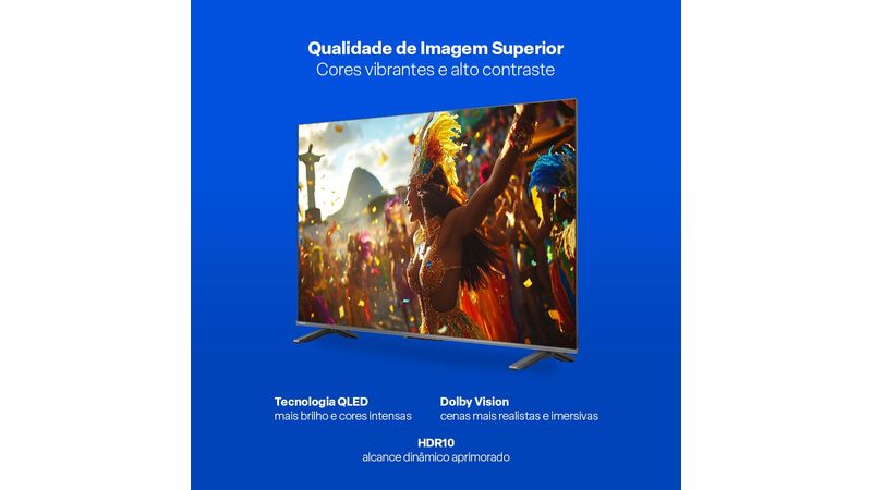 A tecnologia QLED e a resolução 4K proporcionam um brilho preciso e uniforme, com cores vibrantes e detalhes nítidos, oferecendo uma experiência visual de alta qualidade.
