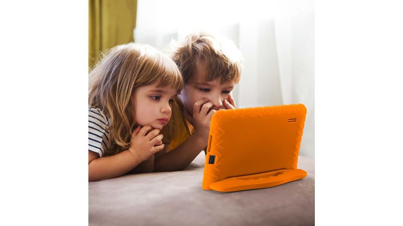 Aguenta as quedas nas brincadeirasO tablet acompanha uma capa emborrachada de proteção com alça flexível, que também serve de suporte. Ou seja, o tablet aguenta as quedas durante a brincadeira e fica em pé em superfícies lisas, para a criança assistir aos vídeos e desenhos.